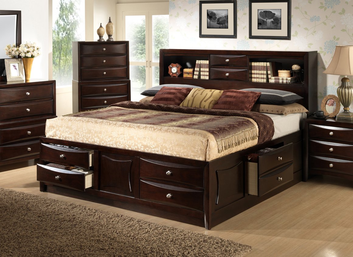 - Contemporary espresso finish storage queen size bed; giving you all the room you need for your items